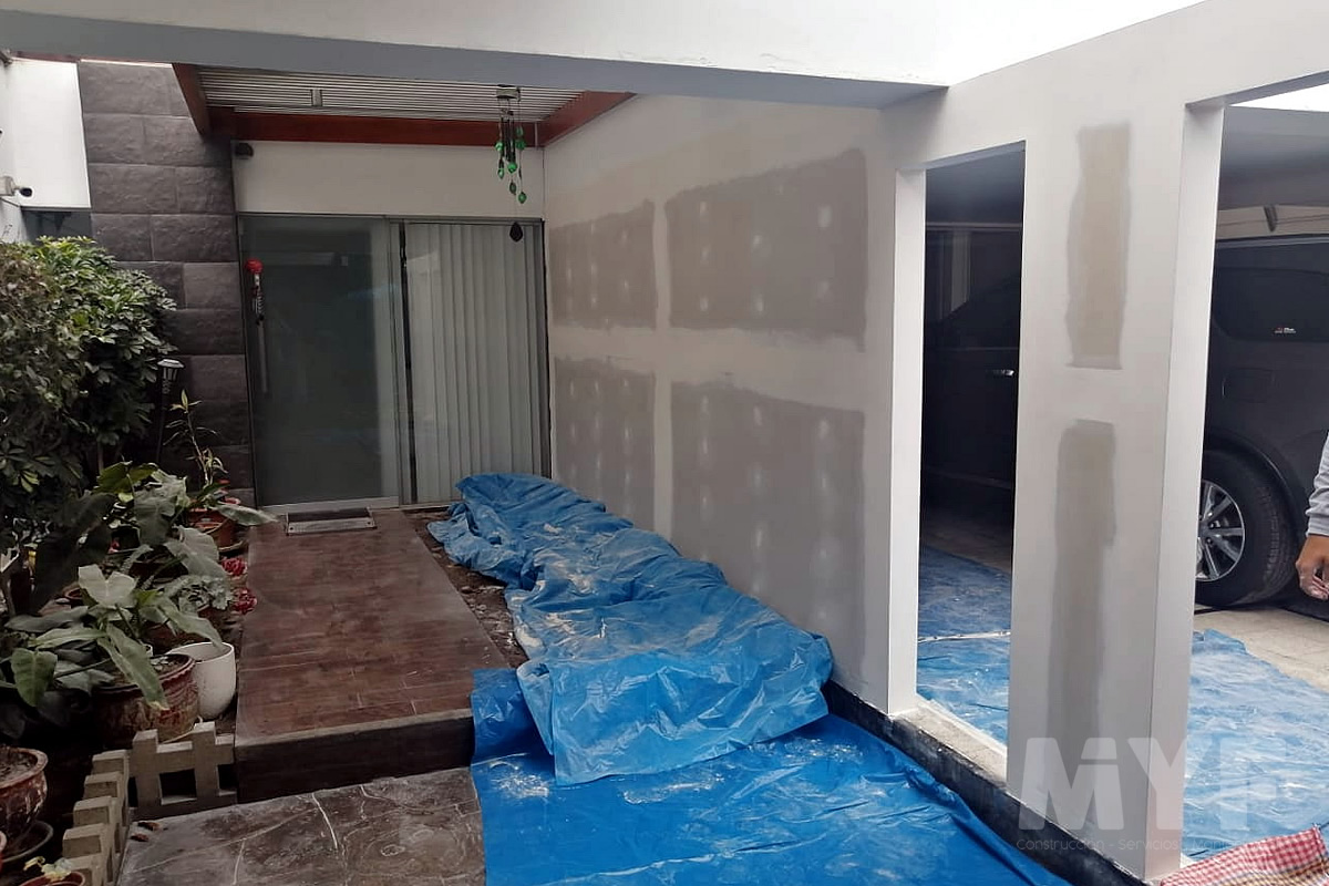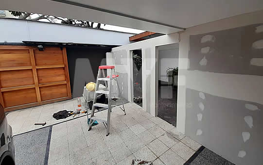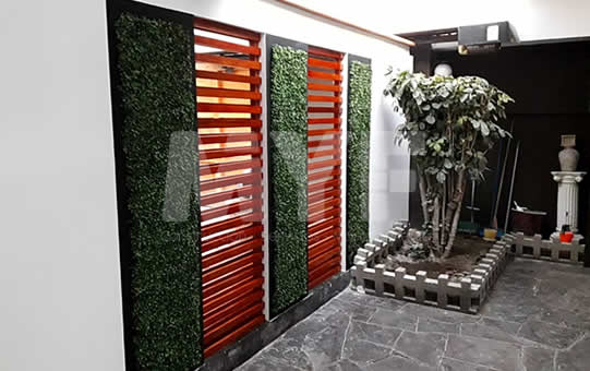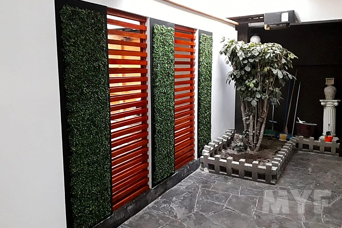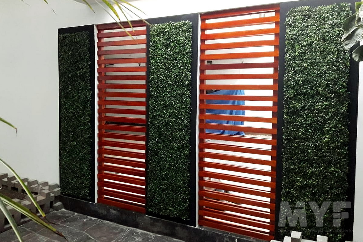 Instalación de drywall, jardín vertical y división en puertas de madera.