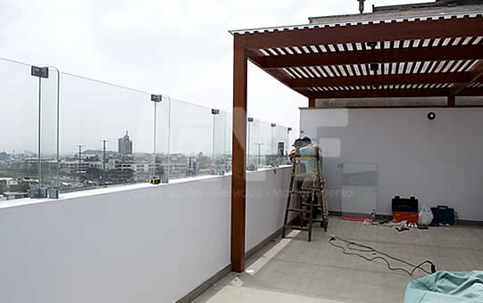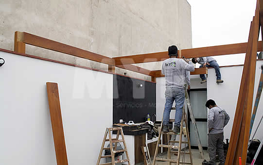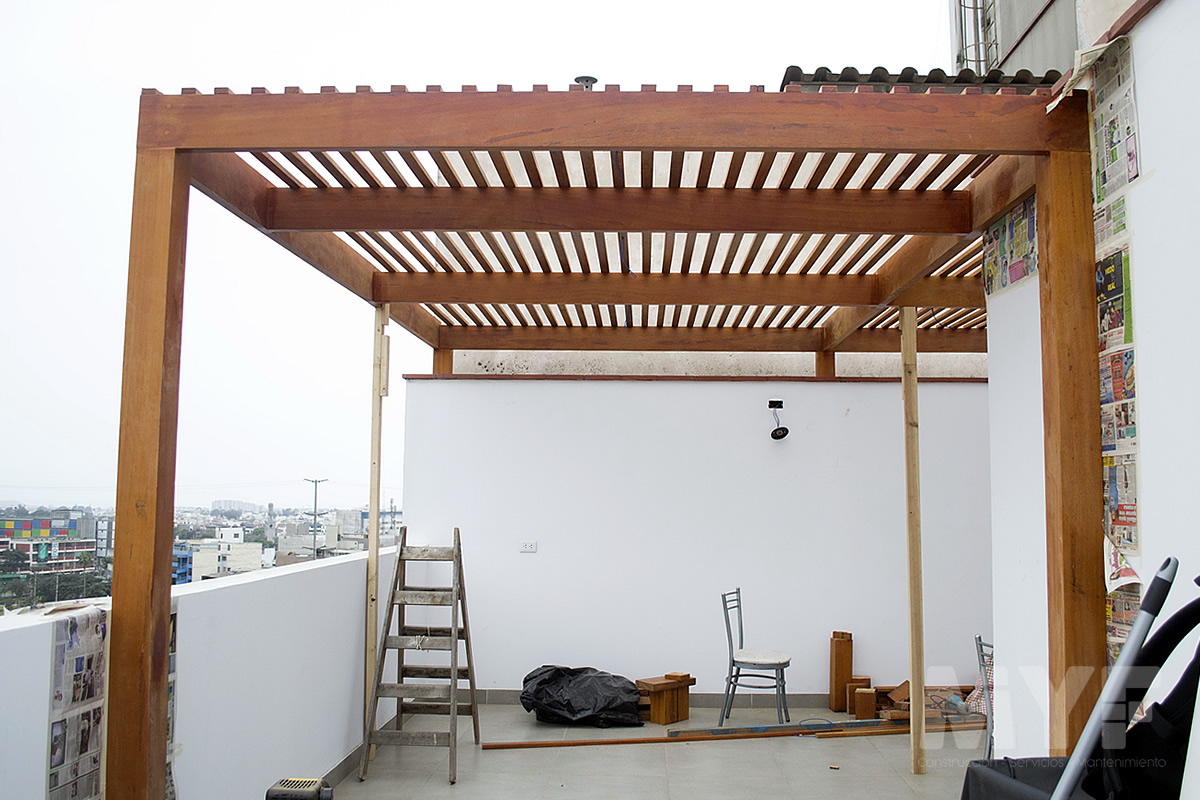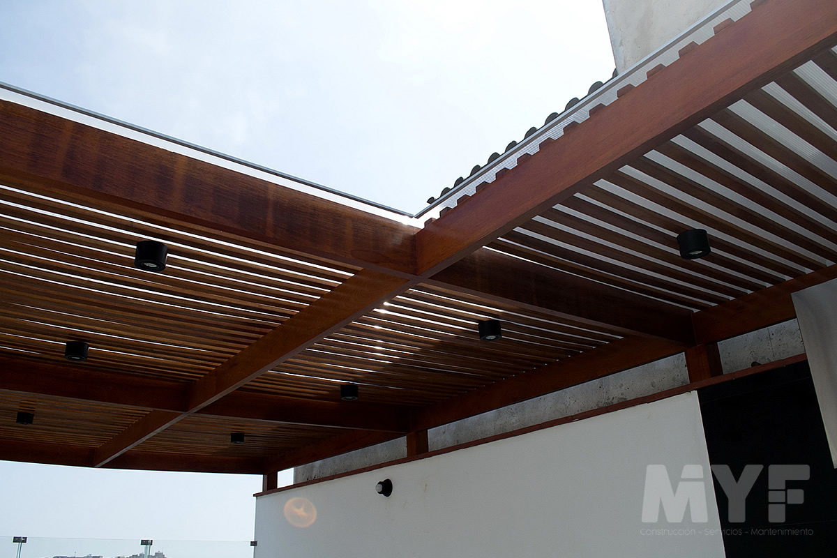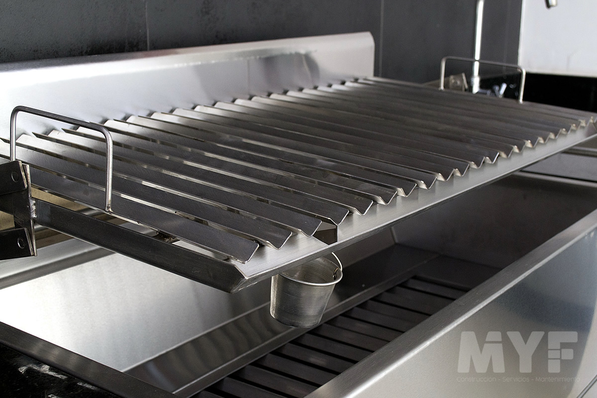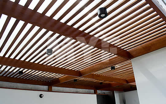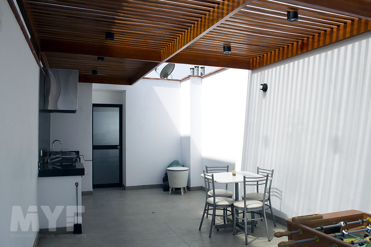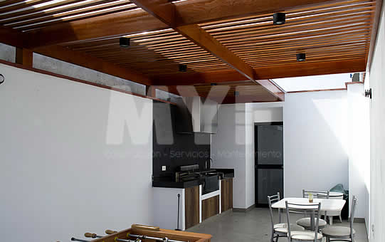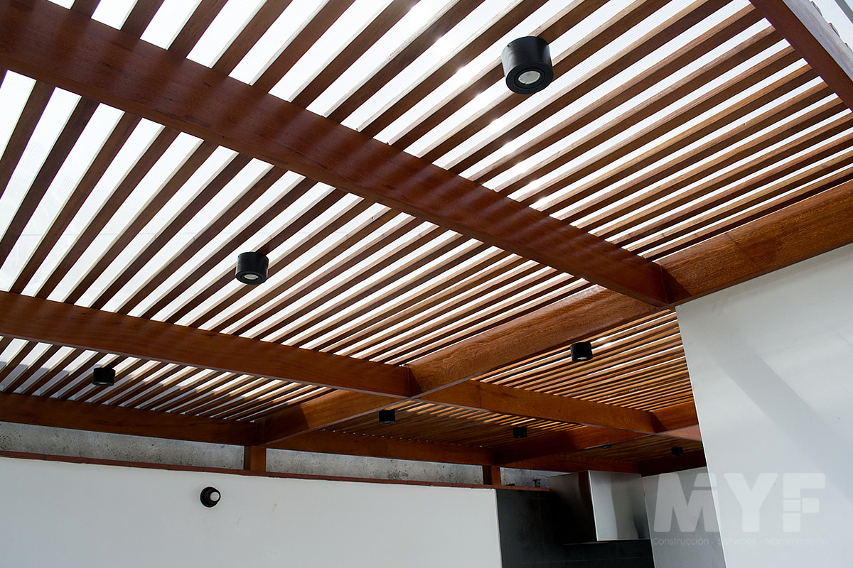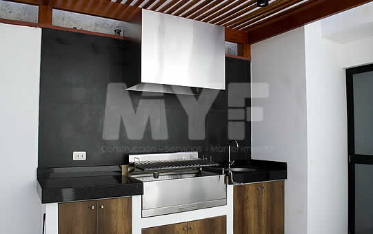 Techo sol y sombra de madera huayruro con policarbonato y perfil de aluminio. Parrilla y campana 100% acero inoxidable 304. Cortaviento de vidrio templado.