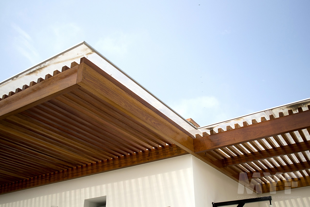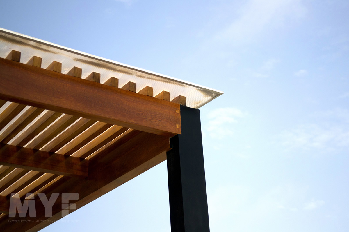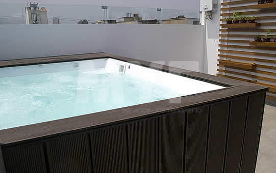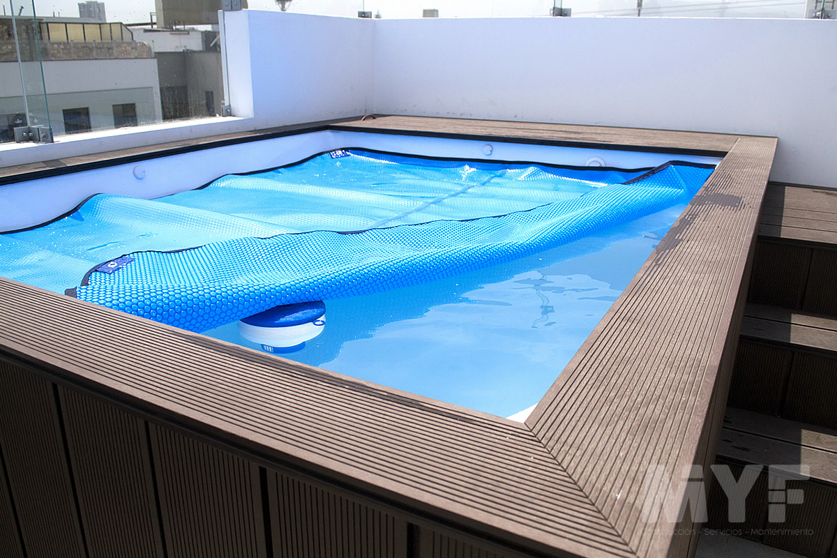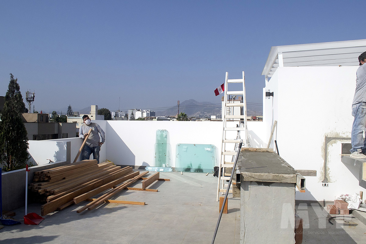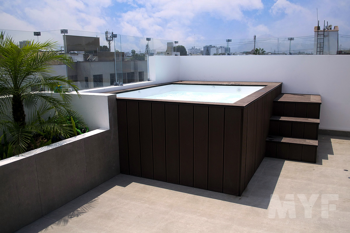 Piscina/Jacuzzi de acrílico 1.95 x 2 x 0.90 de profundidad, con temperado y revestimiento exterior de deck WPC (70% Plástico y 30% madera). Techo sol y sombra de madera huayruro con policarbonato y perfil de aluminio. Parrilla 100% acero inoxidable 304. Ampliación de oficina en drywall con jardinera y mamparas de vidrio templado.
