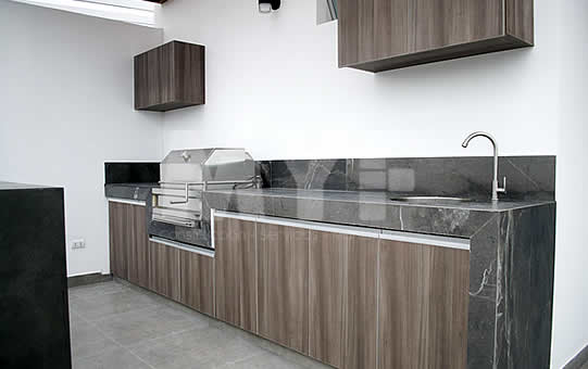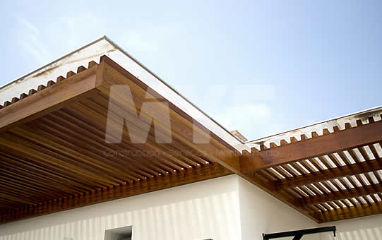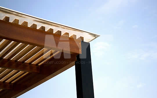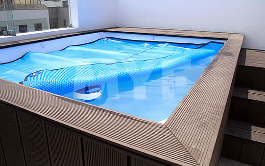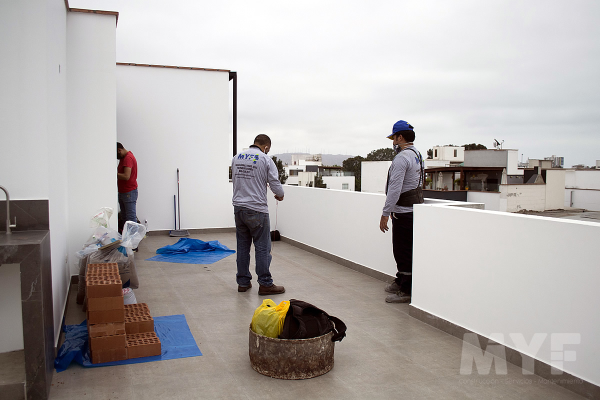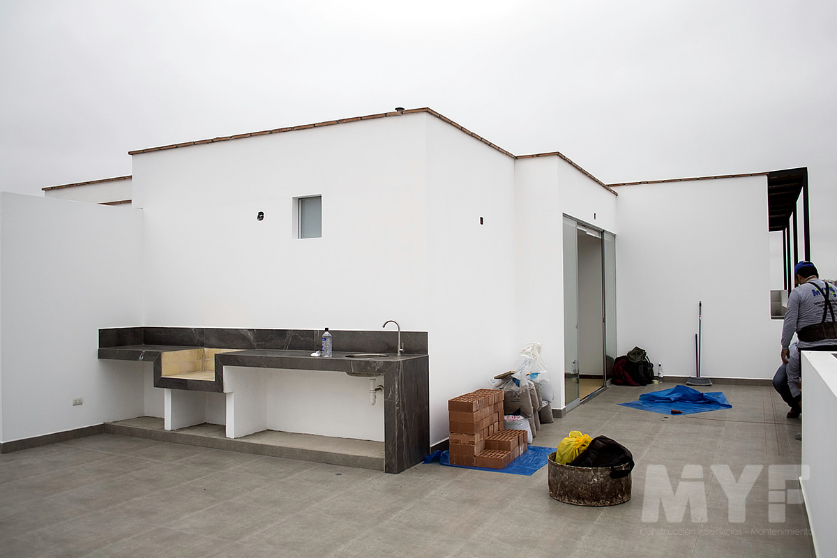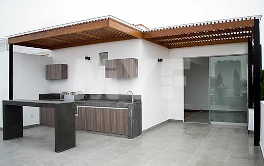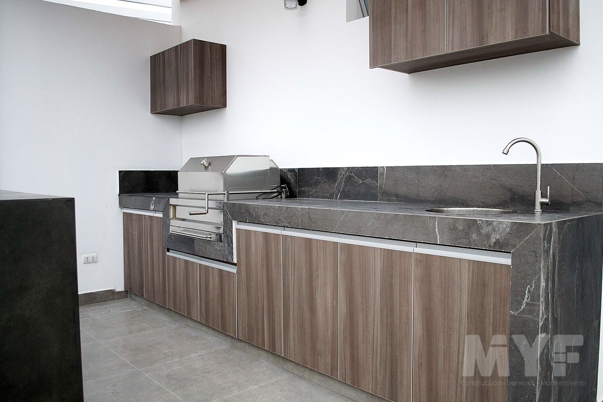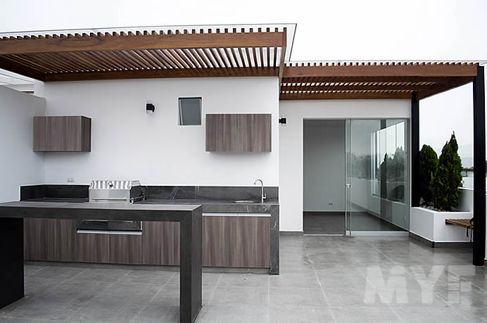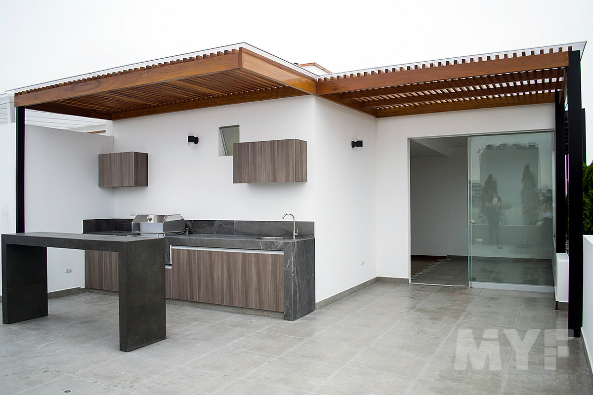 Piscina/Jacuzzi de acrílico 1.95 x 2 x 0.90 de profundidad, con temperado y revestimiento exterior de deck WPC (70% Plástico y 30% madera). Techo sol y sombra de madera huayruro con policarbonato y perfil de aluminio. Parrilla 100% acero inoxidable 304. Ampliación de oficina en drywall con jardinera y mamparas de vidrio templado.