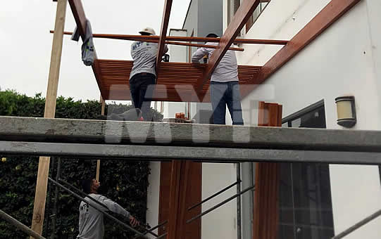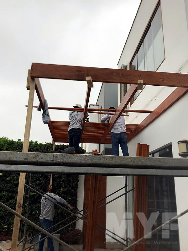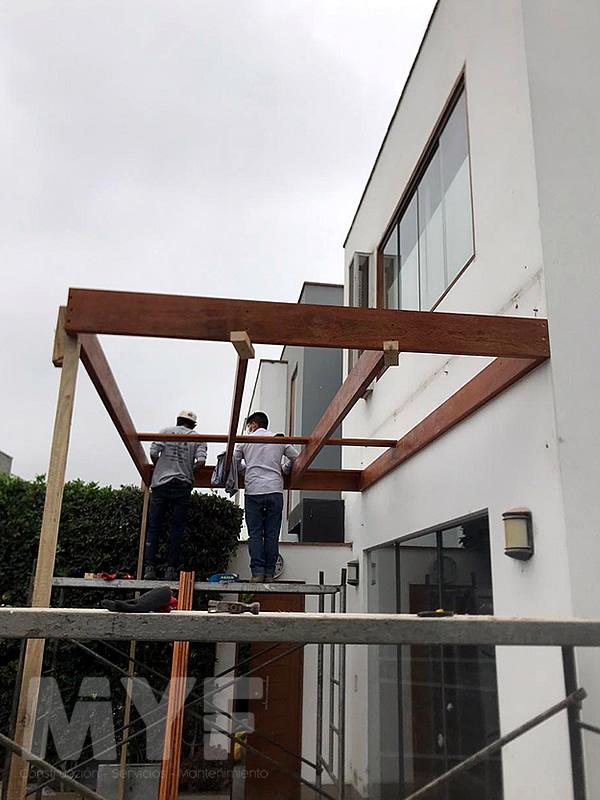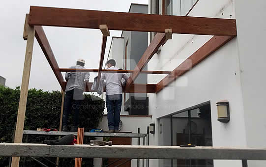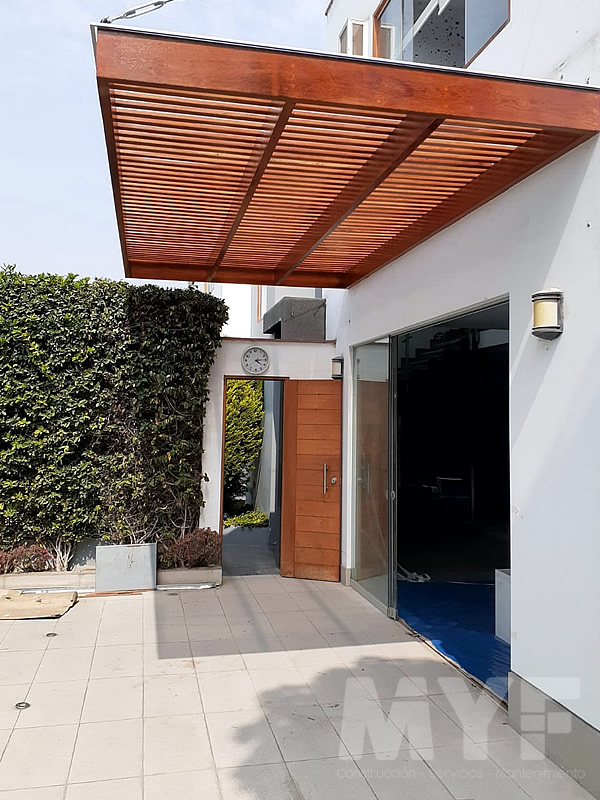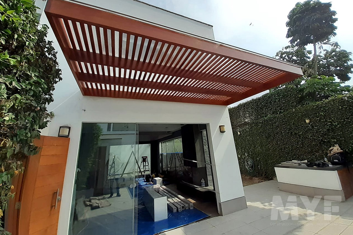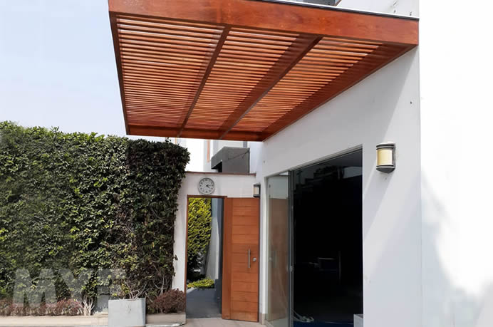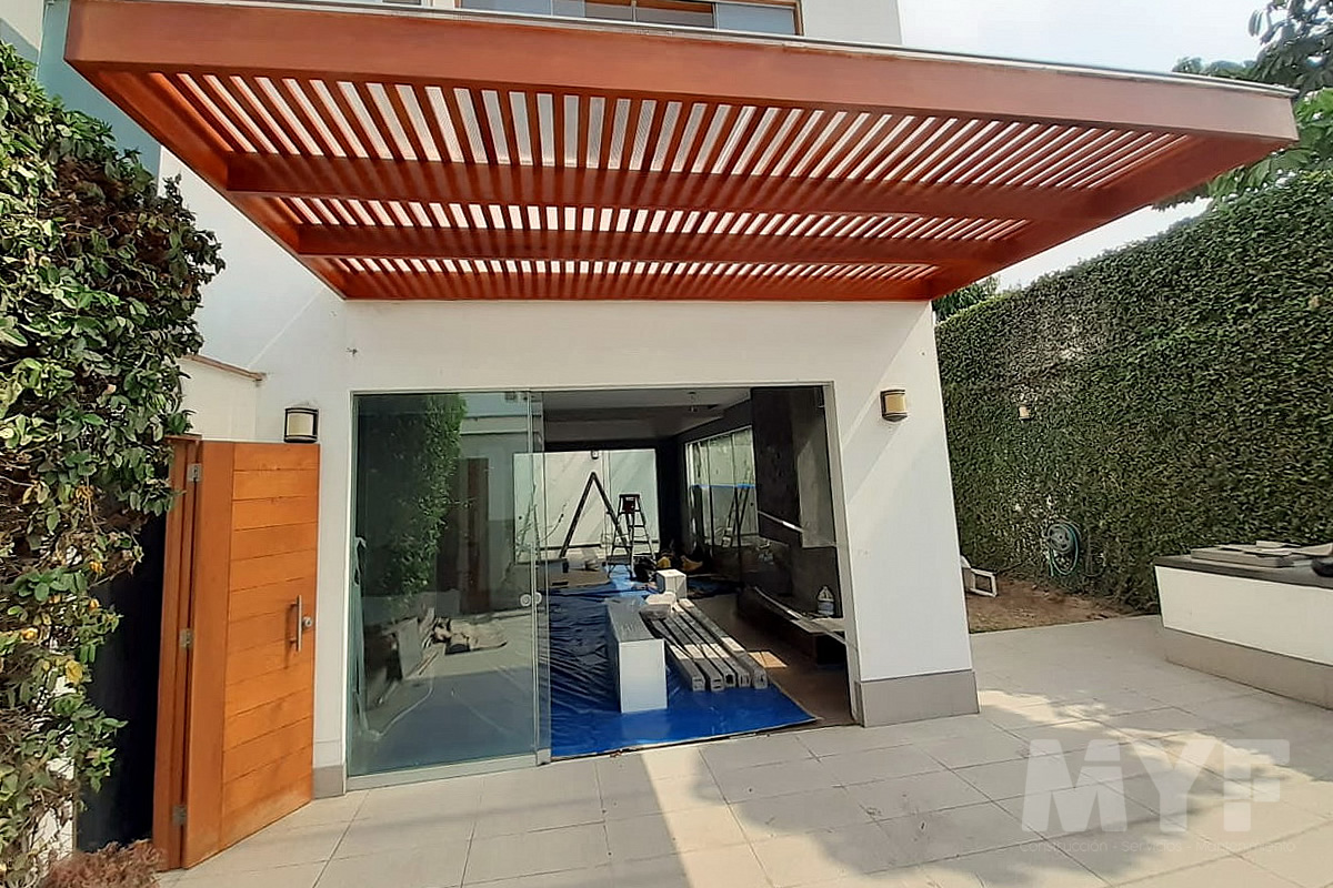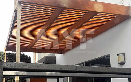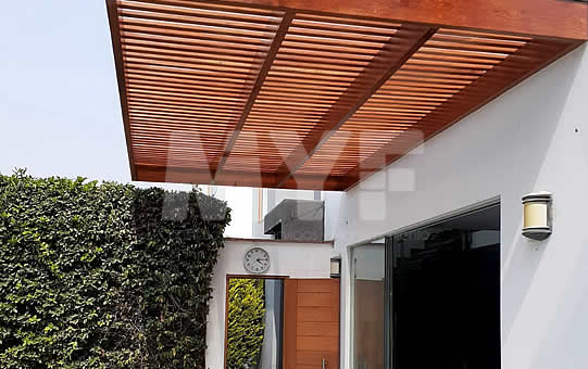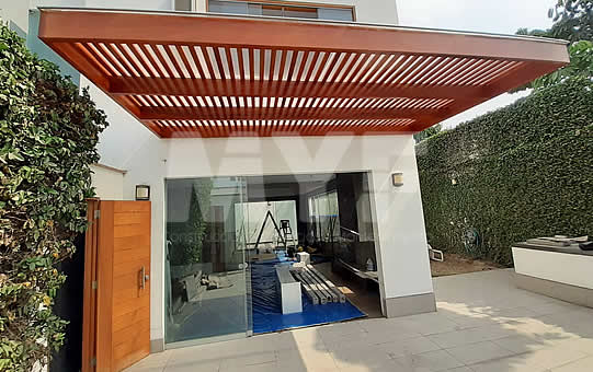 Techo sol y sombra de madera huayruro con policarbonato y perfil de aluminio.
