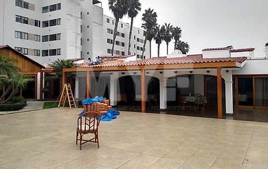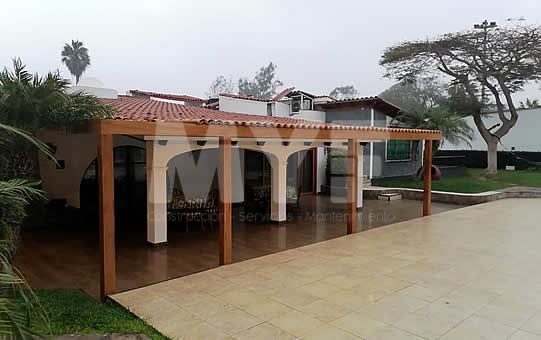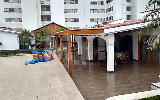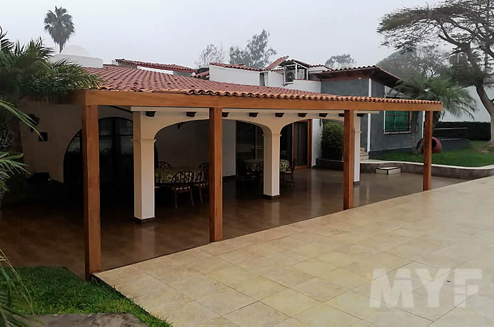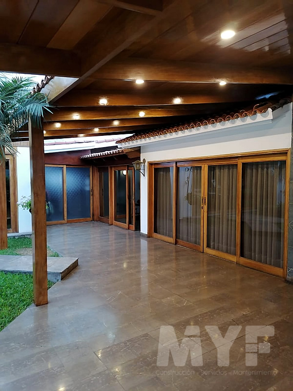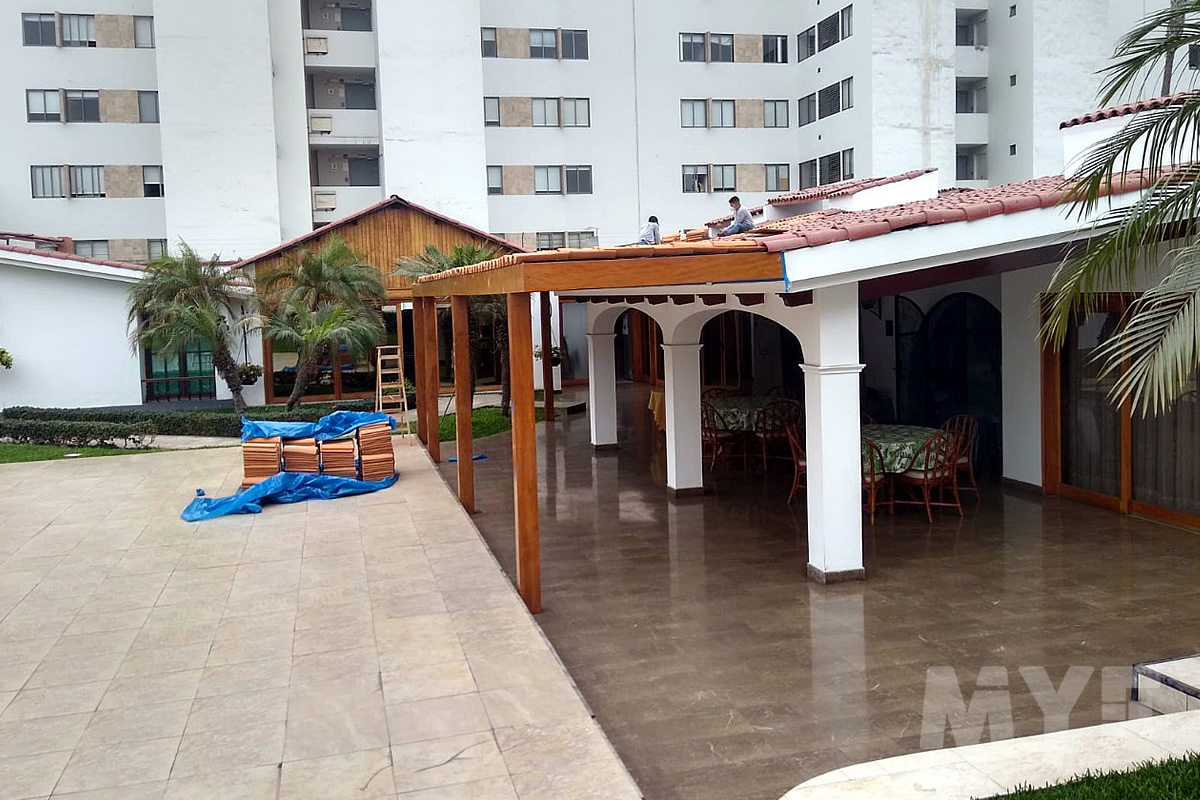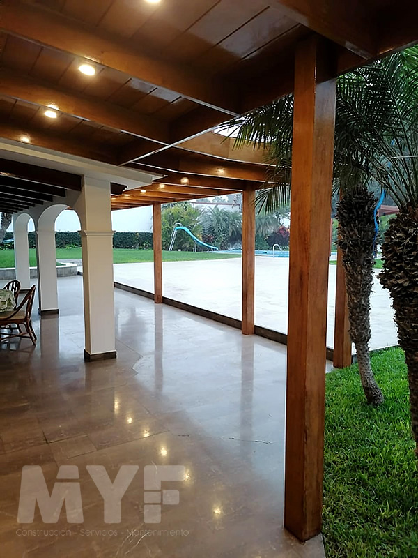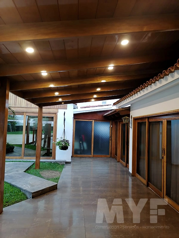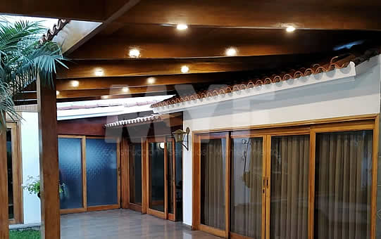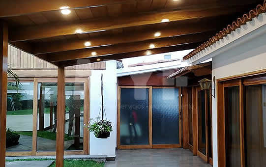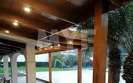 Techo sol y sombra machihembrado de madera huayruro e iluminación.